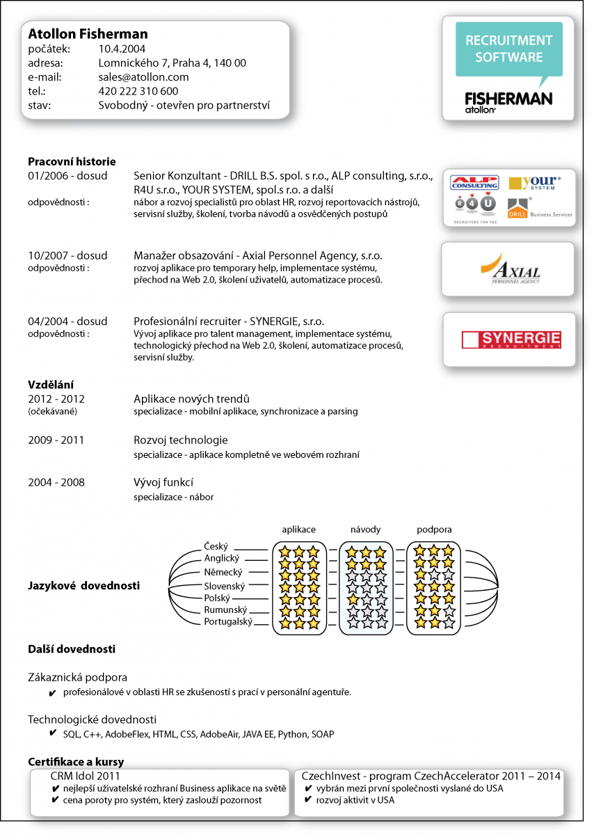 Protože je náš systém Fisherman zaměřen na pomoc personálním agenturám, rozhodli jsme se napsat historii aplikace formou CV a obsah mailu stylizovat jak jinak než, jako motivační dopis. Zároveň jsme se snažili, v rámci přiloženého životopisu, ponechat dostatek prostoru k rozpoznání, že se nejedná o živou osobu, ale o nabídku systému.